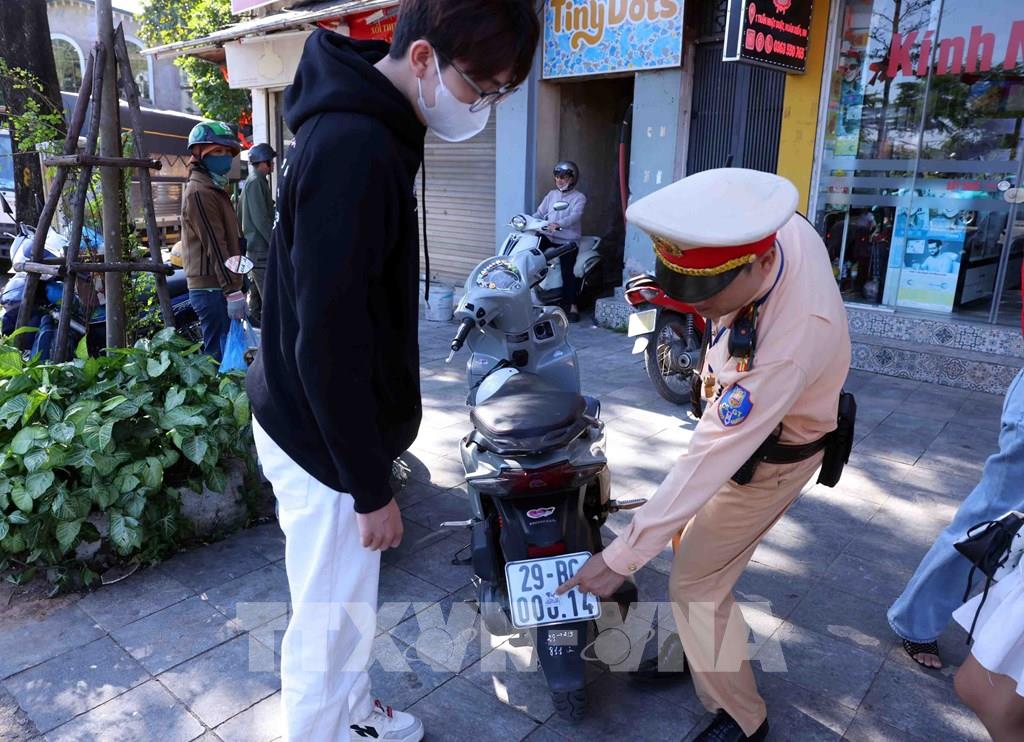 Các trường hợp dán, che biển số khi tham gia giao thông được yêu cầu khôi phục tình trạng ban đầu. Ảnh: Phạm Kiên - TTXVN