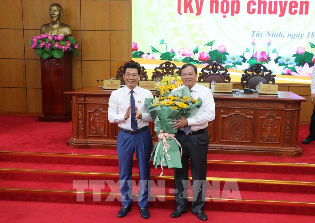 Ông Nguyễn Mạnh Hùng, Phó Bí thư Tỉnh ủy, Chủ tịch HĐND tỉnh Tây Ninh tặng hoa chúc mừng tân Chủ tịch UBND tỉnh Tây Ninh Lê Văn Hẳn. Ảnh: Bùi Giang - TTXVN