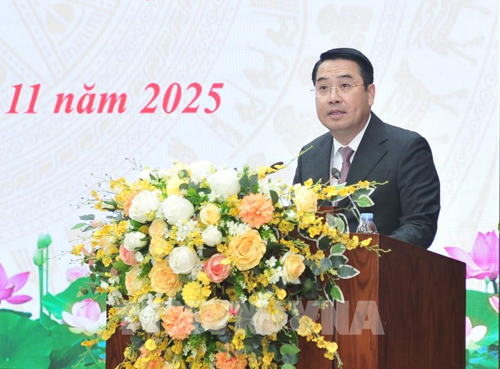 Ông Nguyễn Tuấn Anh, tân Chủ tịch UBND tỉnh Lào Cai phát biểu nhận nhiệm vụ. Ảnh: Tuấn Khôi-TTXVN