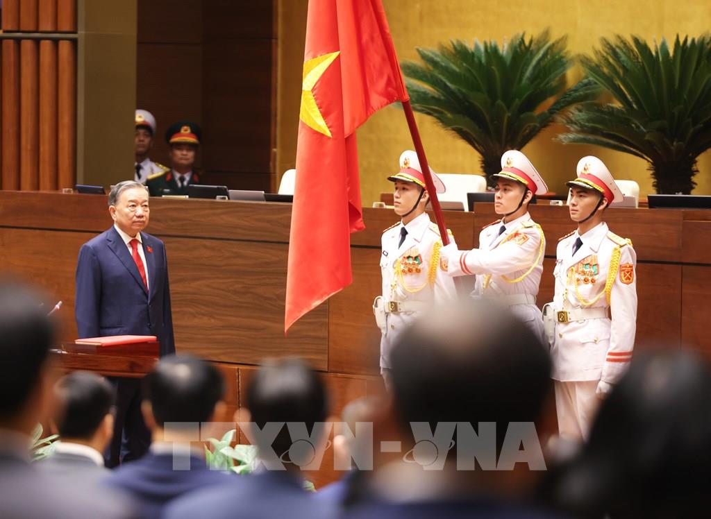 Trước Quốc kỳ, Quốc hội và cử tri cả nước, Chủ tịch nước Tô Lâm tuyên thệ: “Dưới cờ đỏ sao vàng thiêng liêng của Tổ quốc, trước Quốc hội, đồng bào và cử tri, tôi, Chủ tịch nước Cộng hòa xã hội chủ nghĩa Việt Nam xin tuyên thệ: Tuyệt đối trung thành với Tổ quốc, với nhân dân, với Hiến pháp nước Cộng hòa xã hội chủ nghĩa Việt Nam, nỗ lực phấn đấu, hoàn thành tốt mọi nhiệm vụ mà Đảng, Nhà nước và nhân dân giao phó”.