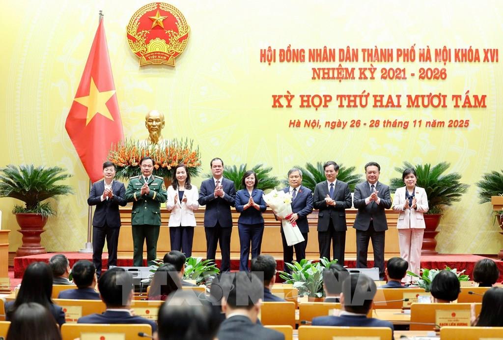 Các đại biểu tặng hoa tân Chủ tịch Ủy ban nhân dân thành phố Hà Nội Vũ Đại Thắng. Ảnh: An Đăng - TTXVN