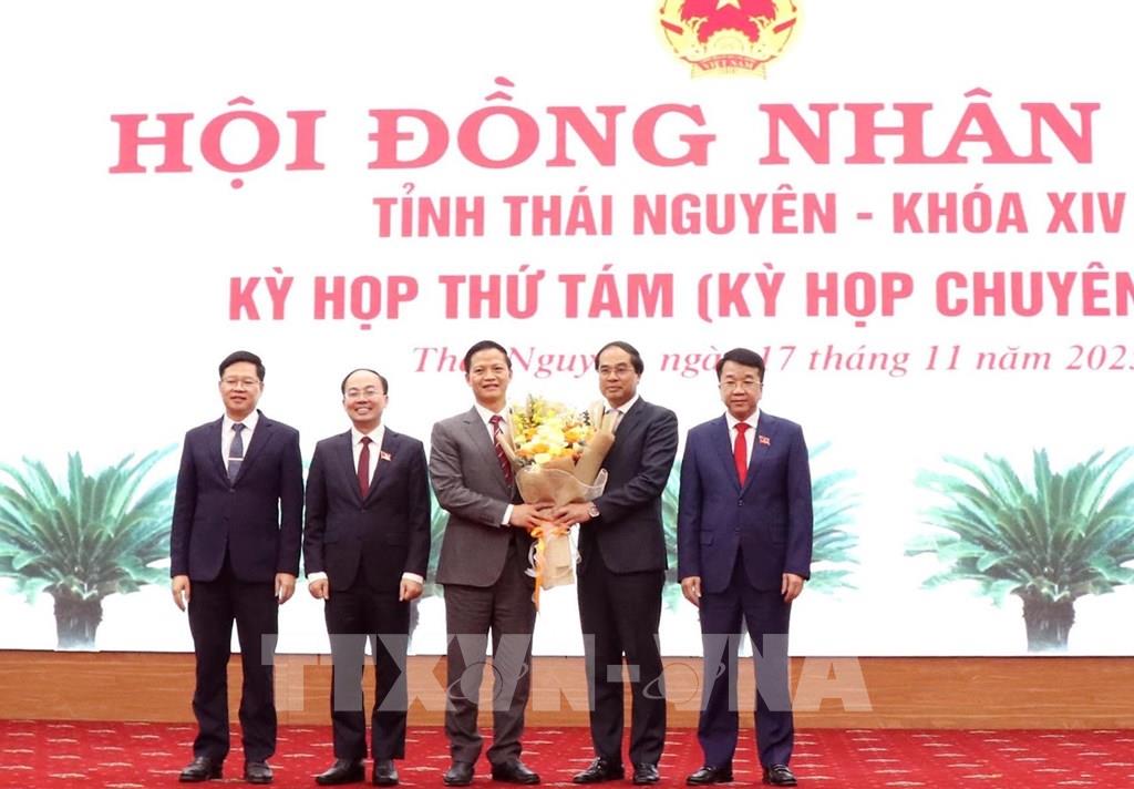 Lãnh đạo Tỉnh ủy Thái Nguyên tặng hoa chúc mừng ông Vương Quốc Tuấn được bầu giữ chức Chủ tịch UBND tỉnh Thái Nguyên. Ảnh: Trần Trang - TTXVN