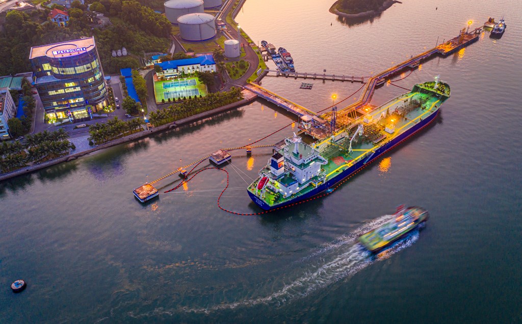 Tiếp nhận tàu xăng dầu tại Cảng dầu B12. Ảnh: Petrolimex
