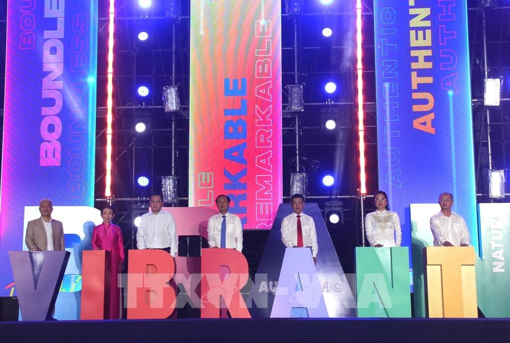 Đại biểu thực hiện nghi thức phát động Tuần lễ Du lịch Thành phố Hồ Chí Minh. Ảnh: Mỹ Phương - TTXVN