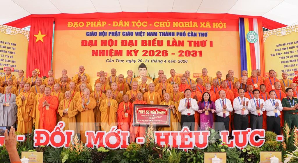 Các vị ủy viên Ban Trị sự nhiệm kỳ 2026 - 2031 và lãnh đạo thành phố tại Đại hội. Ảnh: Hồng Thái - TTXVN