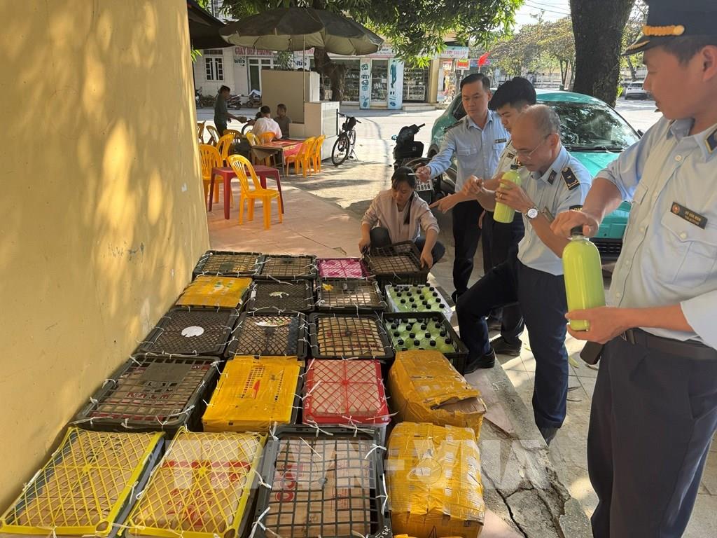 Đội Quản lý thị trường số 6 (Tuyên Quang) phát hiện 440 chai rượu màu xanh cốm loại 1 lít/chai không rõ nguồn gốc xuất xứ. Ảnh: TTXVN phát
