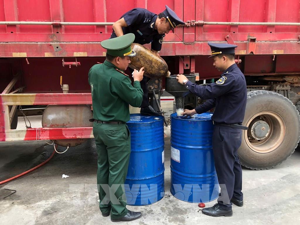 Tang vật thu giữ được 400 lít nghi dầu diesel được vận chuyển trái phép qua khu vực biên giới. Ảnh: TTXVN phát