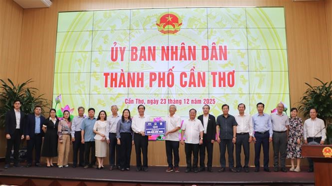 Lãnh đạo Hội Người cao tuổi Việt Nam trao bảng tượng trưng quà hỗ trợ người cao tuổi khó khăn trên địa bàn thành phố Cần Thơ. Ảnh: Hồng Thái - TTXVN