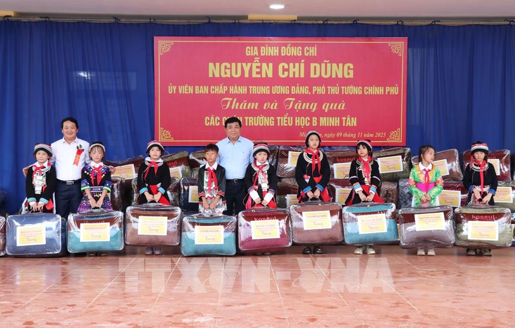 Phó Thủ tướng Nguyễn Chí Dũng trao 372 suất quà cho học sinh trường Tiểu học B Minh Tân (Tuyên Quang). Ảnh Đức Thọ - TTXVN