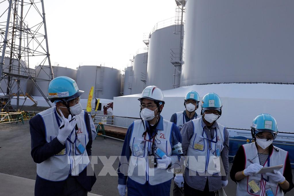Đoàn phóng viên nước ngoài thị sát các bể chứa nước thải sau khi được sử dụng để làm mát các thanh nhiên liệu đã qua sử dụng ở các lò phản ứng đang gặp sự cố. Ảnh: Đào Thanh Tùng-phóng viên TTXVN tại Nhật Bản