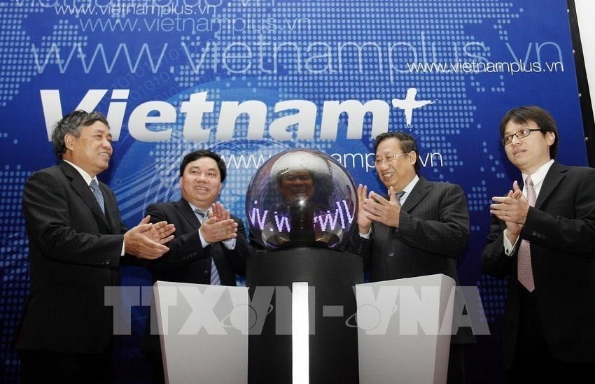 Phó thủ tướng kiêm Bộ trưởng Ngoại giao Phạm Gia Khiêm cùng đại diện Bộ Thông- tin truyền thông và lãnh đạo TTXVN ấn nút điện khai trương báo điện tử Vietnamplus (2008). Ảnh: Tùng Lâm-TTXVN