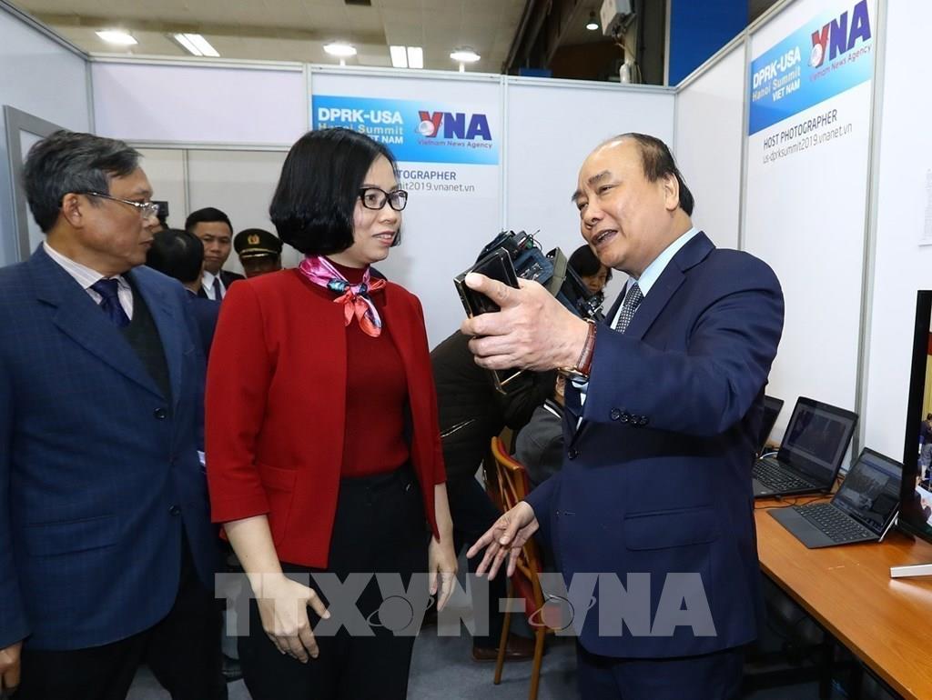 Thủ tướng Nguyễn Xuân Phúc kiểm tra khu vực tác nghiệp của Thông tấn xã Việt Nam tại Trung tâm Báo chí quốc tế trong việc đưa tin về Hội nghị Thượng đỉnh Mỹ - Triều Tiên lần thứ hai, ngày 24/2/2019. Ảnh: Thống Nhất - TTXVN