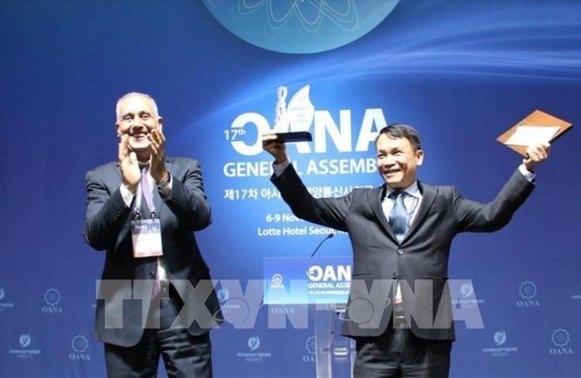 Thay mặt TTXVN, Tổng Giám đốc Nguyễn Đức Lợi nhận "Giải thưởng xuất sắc chất lượng thông tấn" của OANA do Chủ tịch OANA nhiệm kỳ 2016 - 2019 Aslan Aslanov trao tặng. Ảnh: Mạnh Hùng - TTXVN