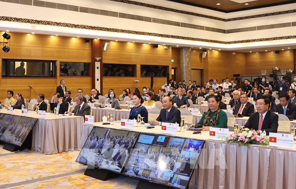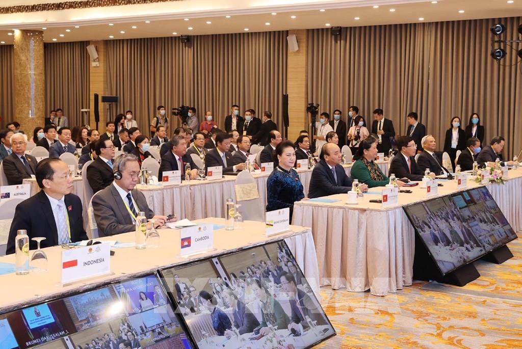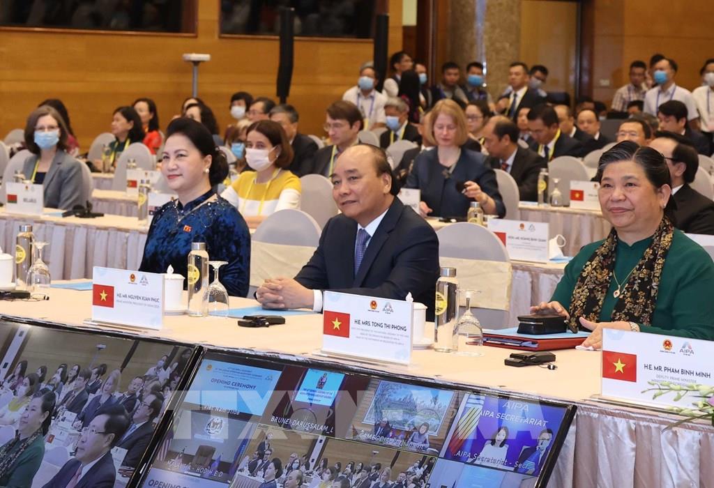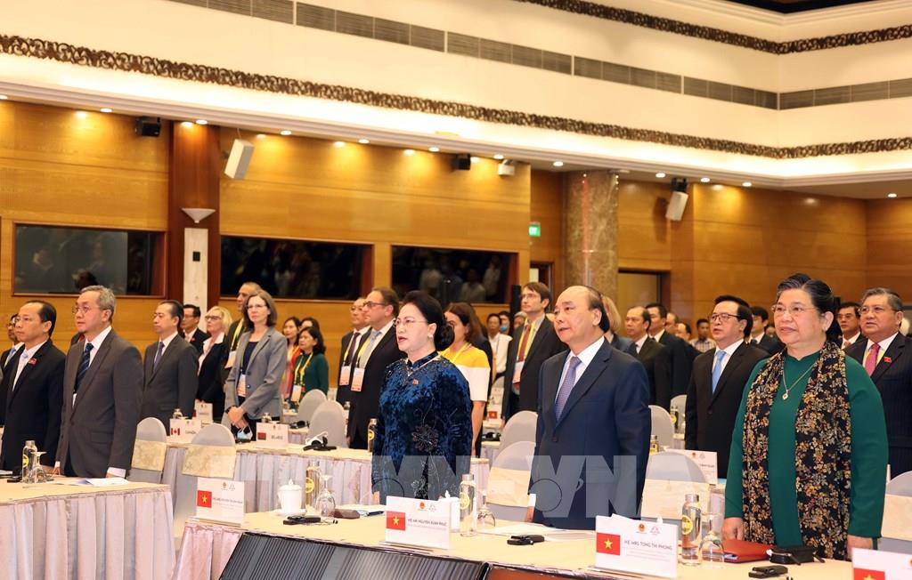 Chủ tịch Quốc hội Nguyễn Thị Kim Ngân, Chủ tịch AIPA- 41, Thủ tướng Nguyễn Xuân Phúc, Chủ tịch ASEAN 2020, Phó Chủ tịch Thường trực Quốc hội Tòng Thị Phóng, Trưởng đoàn đại biểu Quốc hội Việt Nam tại AIPA và các đại biểu tham dự Lễ khai mạc. Ảnh: TTXVN