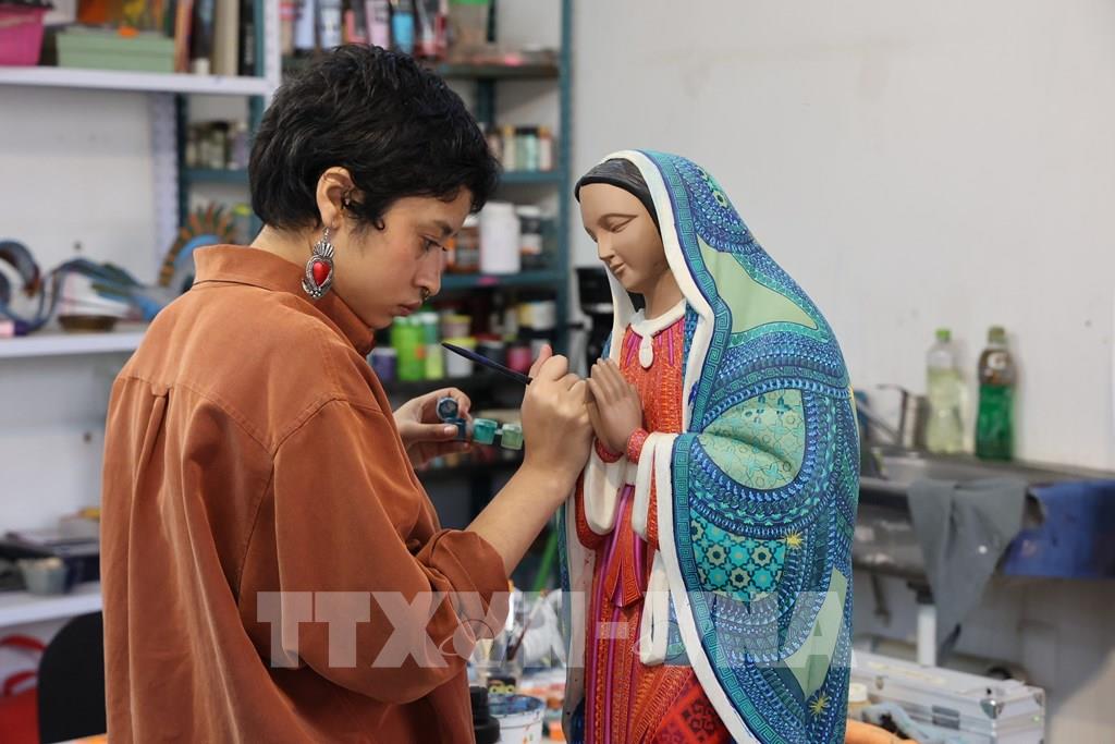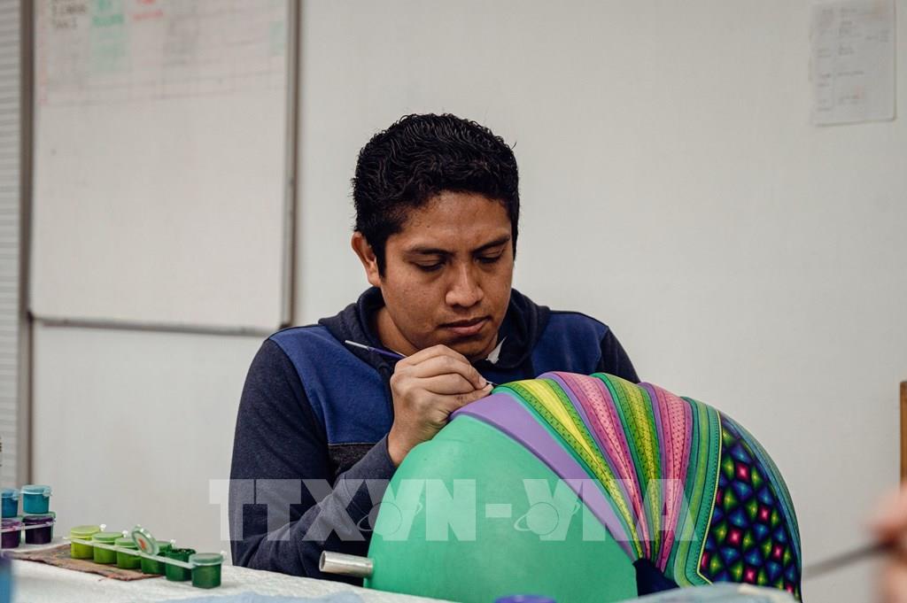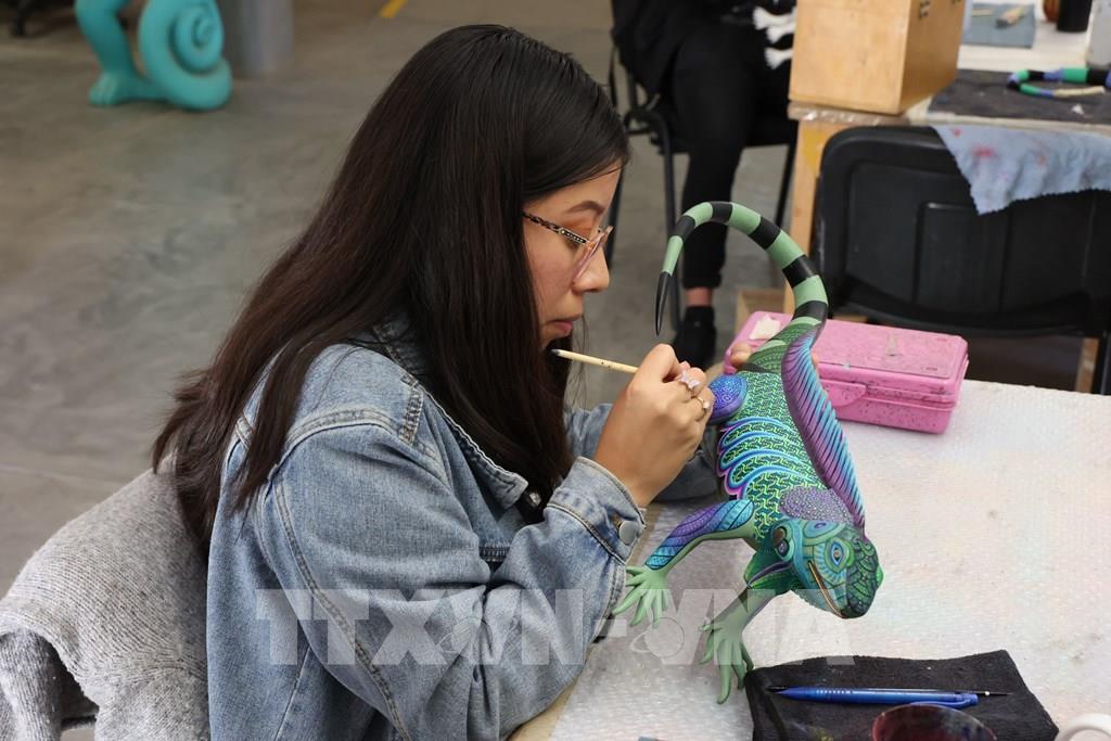 Để tạo ra những đường nét tinh xảo, quá trình sản xuất Alebrijes từ điêu khắc đến trang trí tô màu đòi hỏi thời gian từ vài tuần đến vài tháng tùy vào độ phức tạp của sản phẩm. Ảnh: Trương Phi Hùng-PV TTXVN