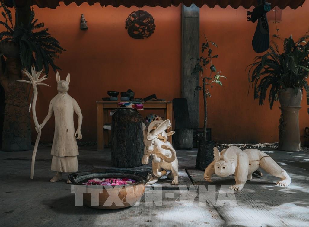 Sau khi hoàn thành công đoạn điêu khắc, bán thành phẩm cần được phơi khô vài tháng trước khi chuyển sang công đoạn hoàn thiện và tô màu trang trí. Ảnh: Trương Phi Hùng-PV TTXVN