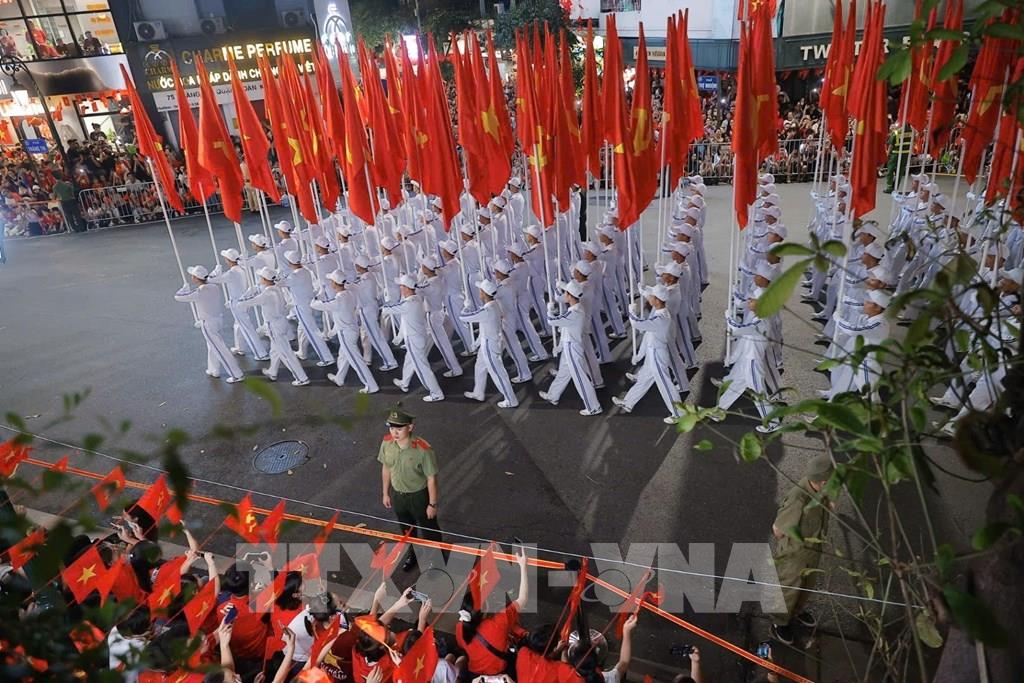Các khối di chuyển trên phố Tràng Tiền về Quảng trường Cách mạng tháng Tám trong sự hồ hởi, chào đón của người dân. Ảnh: Thanh Tùng - TTXVN