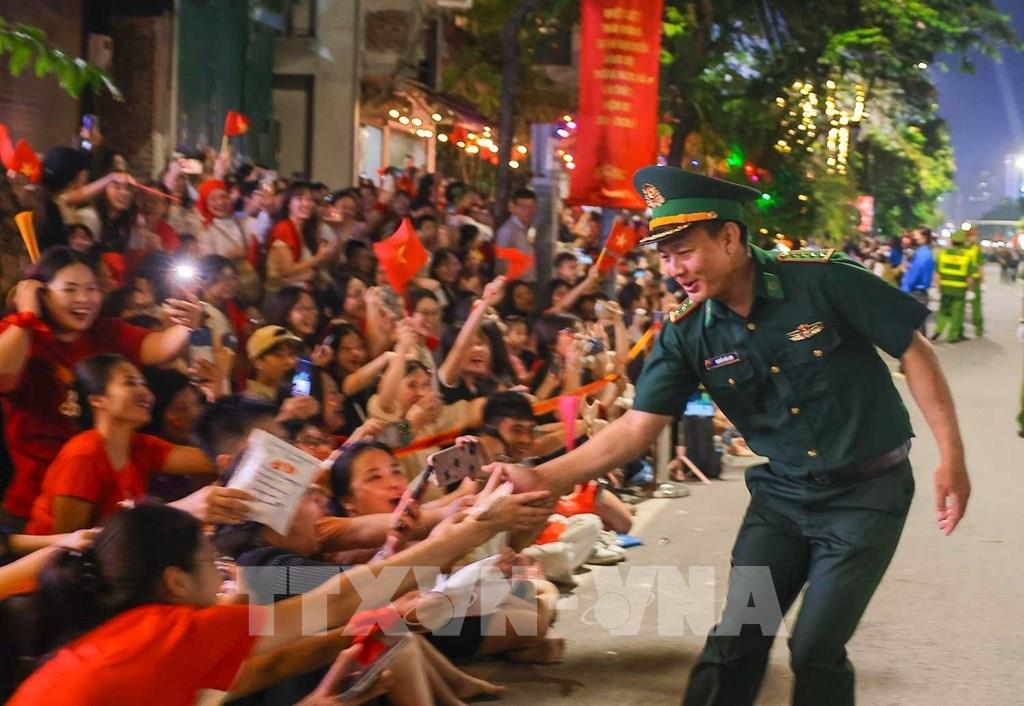 Người dân chúc mừng các chiến sĩ đã hoàn thành nhiệm vụ tổng hợp luyện diễu binh, diễu hành lần thứ 2. Ảnh: Hoàng Hiếu - TTXVN