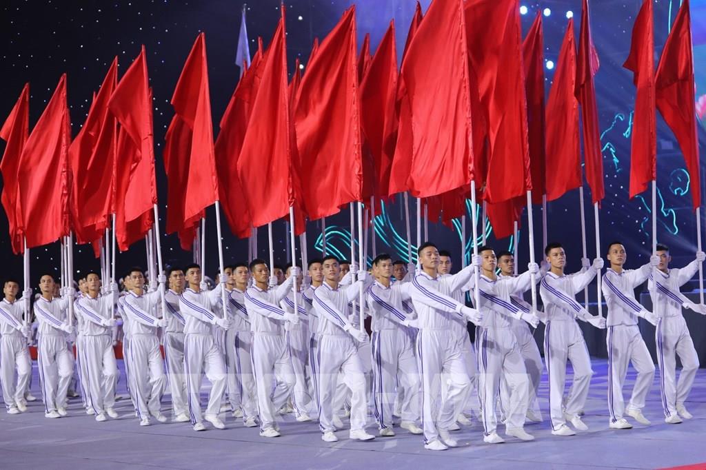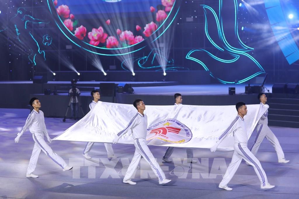 Các vận động viên rước cờ đại hội. Ảnh: Hoàng Hiếu - TTXVN