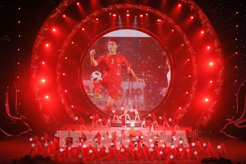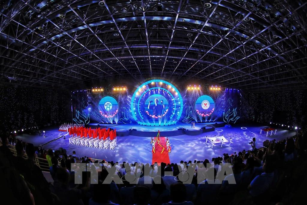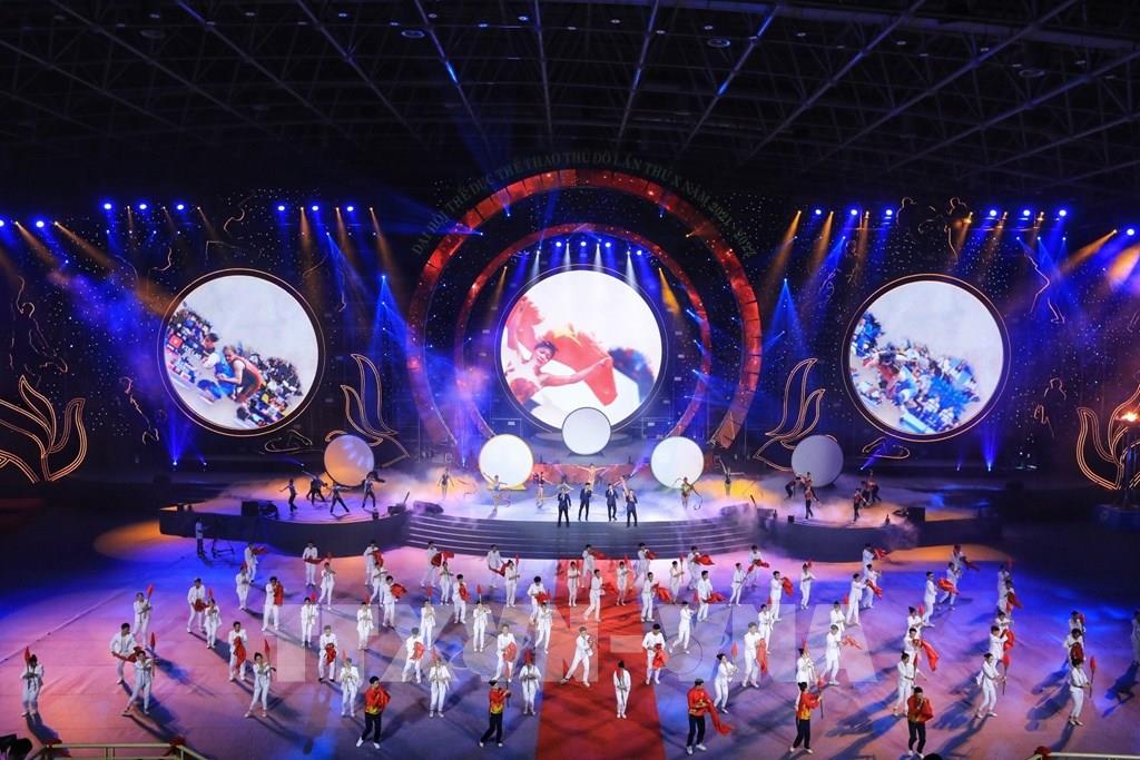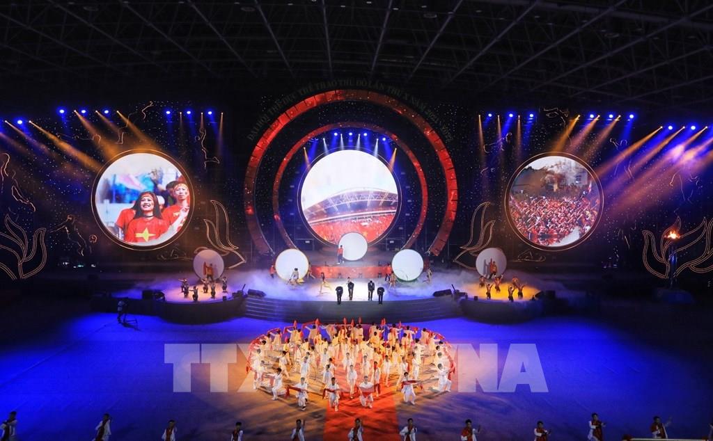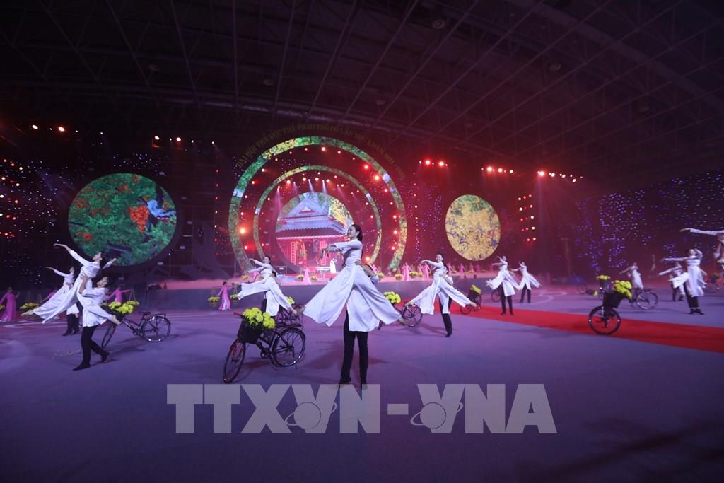 Tiết mục văn nghệ chào mừng đại hội thể dục thể thao Thủ đô lần thứ X năm 2021 - 2022. Ảnh: Tuấn Anh - TTXVN