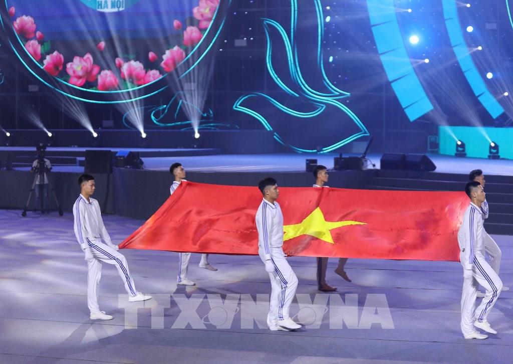 Các vận động viên rước quốc kỳ. Ảnh: Hoàng Hiếu - TTXVN