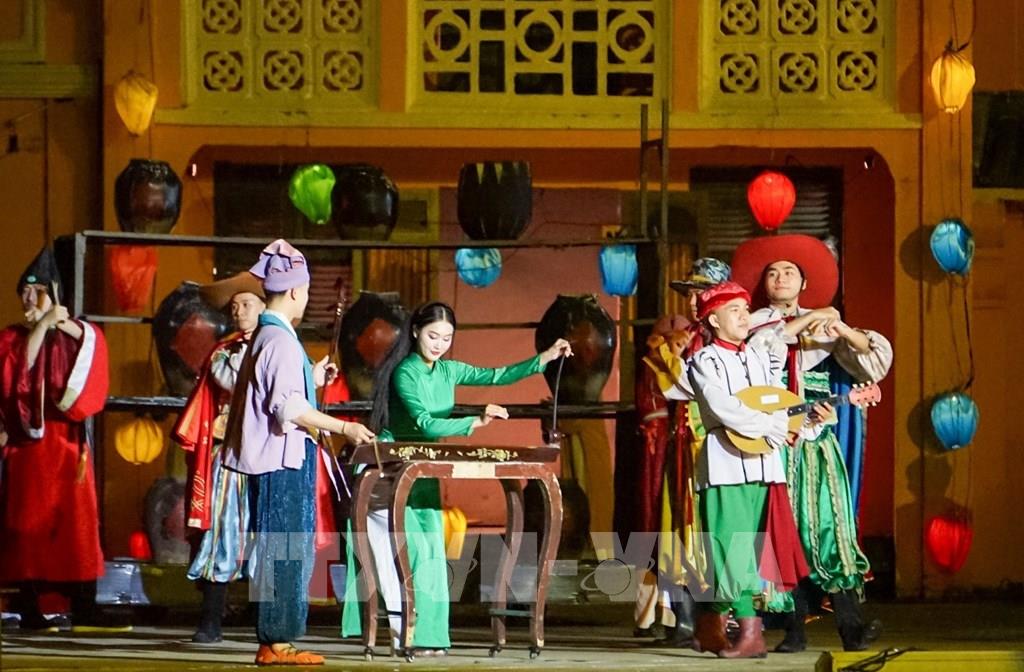 Tái hiện cảnh họp chợ bên bến cảng Faifo năm xưa, nơi các nền văn hóa Việt, Nhật, Trung, Ấn ... cùng hòa quyện và thăng hoa phát triển, làm nên thương cảng sầm uất vào thế kỷ 16-19. Ảnh: Khánh Hoà – TTXVN