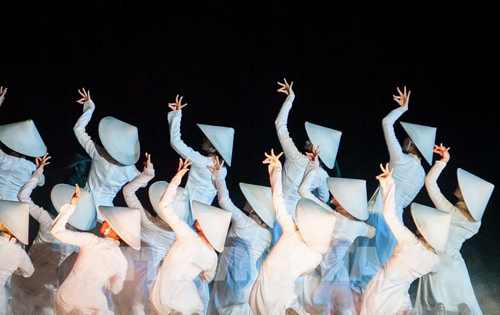 Gần 500 diễn viên biểu diễn, sử dụng nhiều ngôn ngữ nghệ thuật, kết hợp giữa trình diễn, múa, âm nhạc, ánh sáng tại "Ký ức Hội An". Ảnh: Khánh Hoà – TTXVN