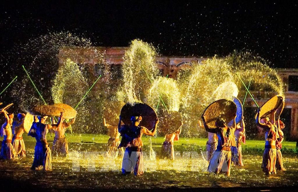 Ký ức Hội An - chương trình nghệ thuật thực cảnh đầy màu sắc, trên sân khấu ngoài trời rộng 25.000m2 với gần 500 diễn viên biểu diễn, sử dụng nhiều ngôn ngữ nghệ thuật. Ảnh: Khánh Hoà – TTXVN