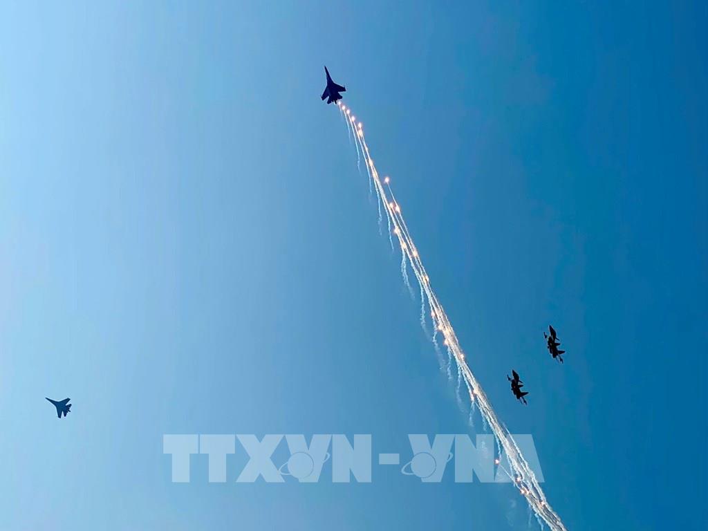 Màn trình diễn phun bẫy nhiệt của máy bay tiêm kích Su-30MK2. Ảnh: Mạnh Linh - TTXVN