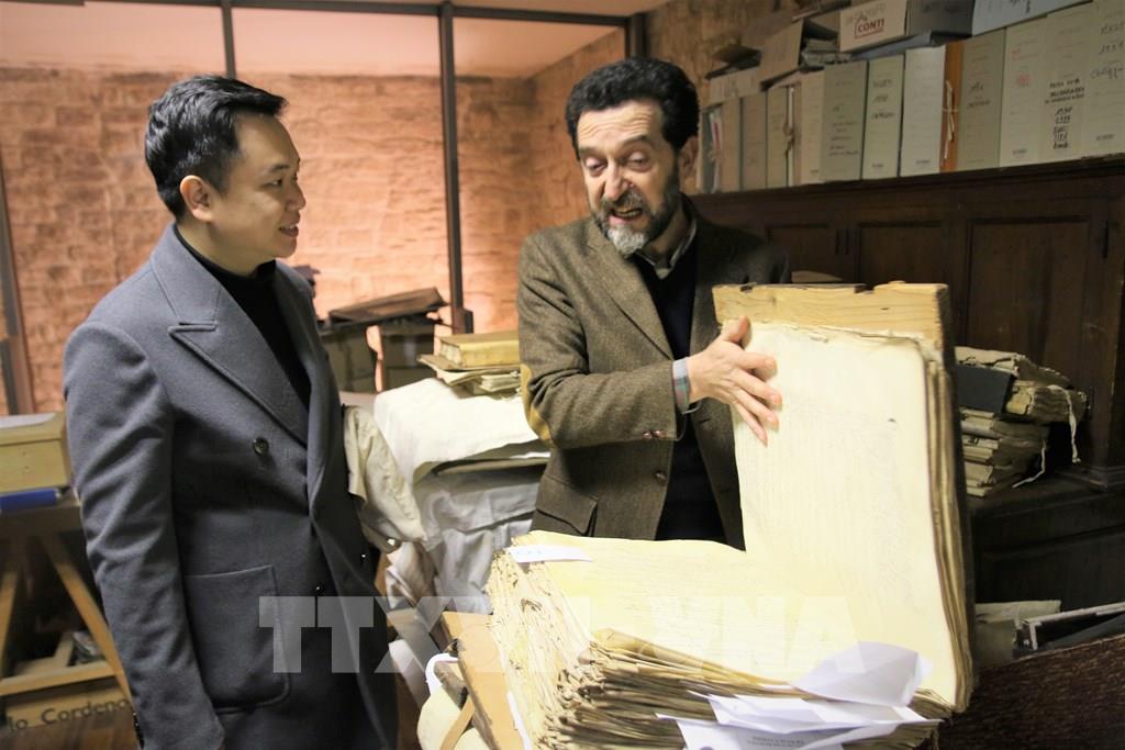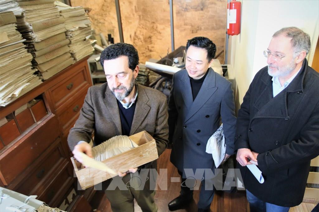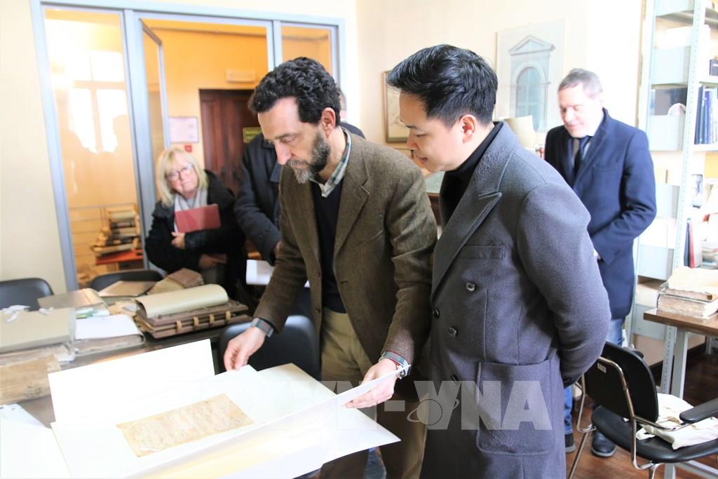 Đại diện Đại sứ quán Việt Nam tại Italy tham quan thư viện thành phố Todi. Ảnh: Thanh Hải, Trường Dụy - TTXVN