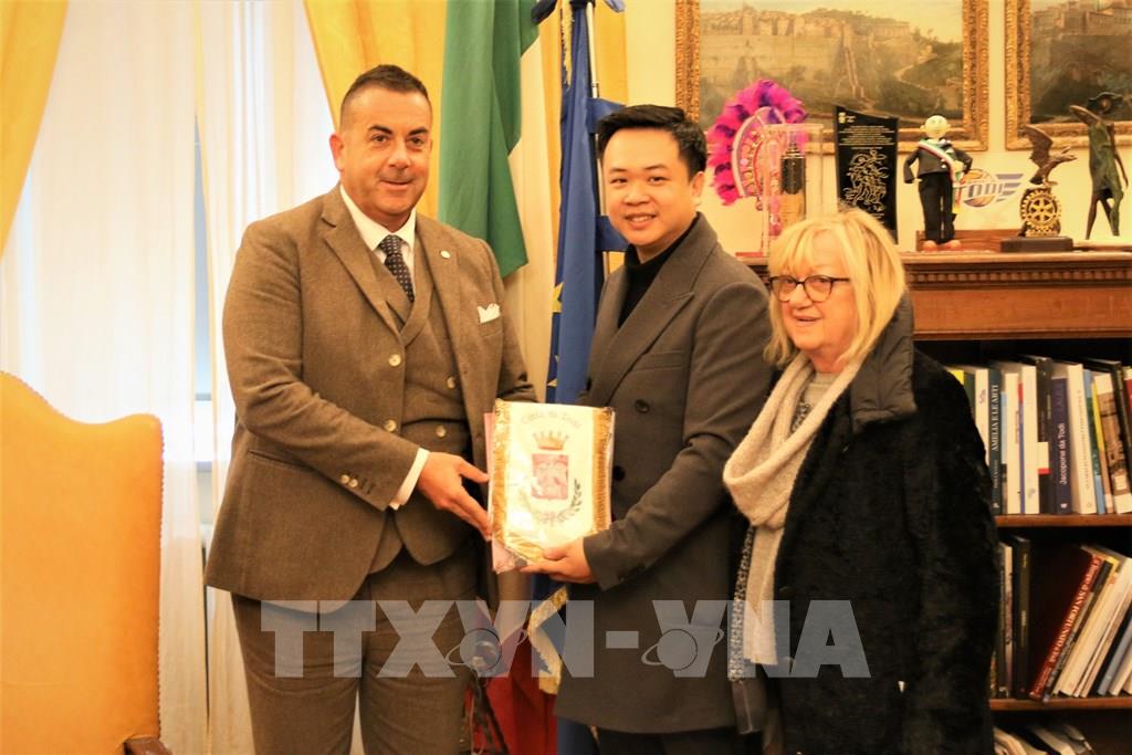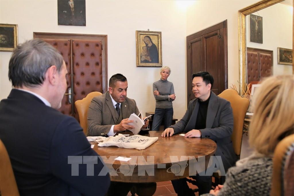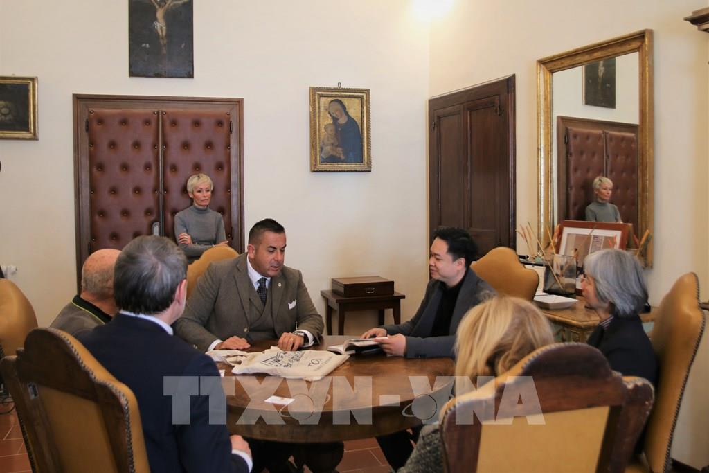 Cán bộ Đại sứ quán Việt Nam tại Italy làm việc với chính quyền thành phố Todi . Ảnh: Thanh Hải, Trường Dụy - TTXVN