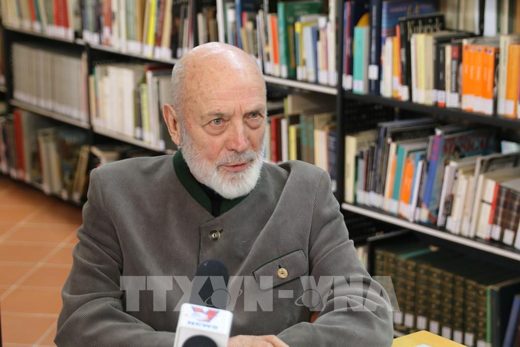 Chủ tịch danh dự của Hiệp hội INTRA Giuseppe Bearzi trả lời phỏng vấn phóng viên TTXVN về việc thành lập thư viện về Chủ tịch Hồ Chí Minh. Ảnh: Thanh Hải, Trường Dụy - TTXVN
