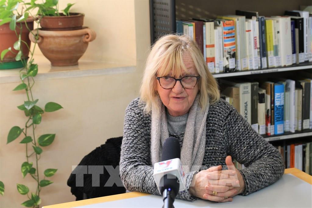 Chủ tịch Hiệp hội văn hóa Pegaso Deana Mannaioli trả lời phỏng vấn phóng viên TTXVN về việc thành lập thư viện về Chủ tịch Hồ Chí Minh. Ảnh: Thanh Hải, Trường Dụy - TTXVN