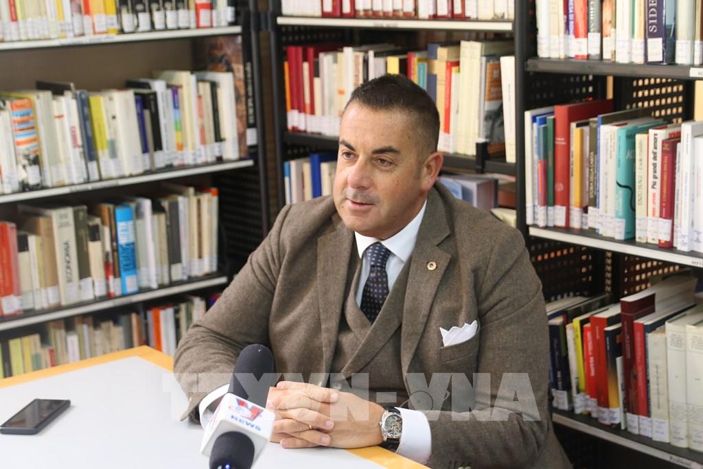 Thị trưởng thành phố Todi Antonio Ruggiano trả lời phỏng vấn phóng viên TTXVN tại Rome về việc thành lập thư viện về Chủ tịch Hồ Chí Minh. Ảnh: Thanh Hải, Trường Dụy - TTXVN