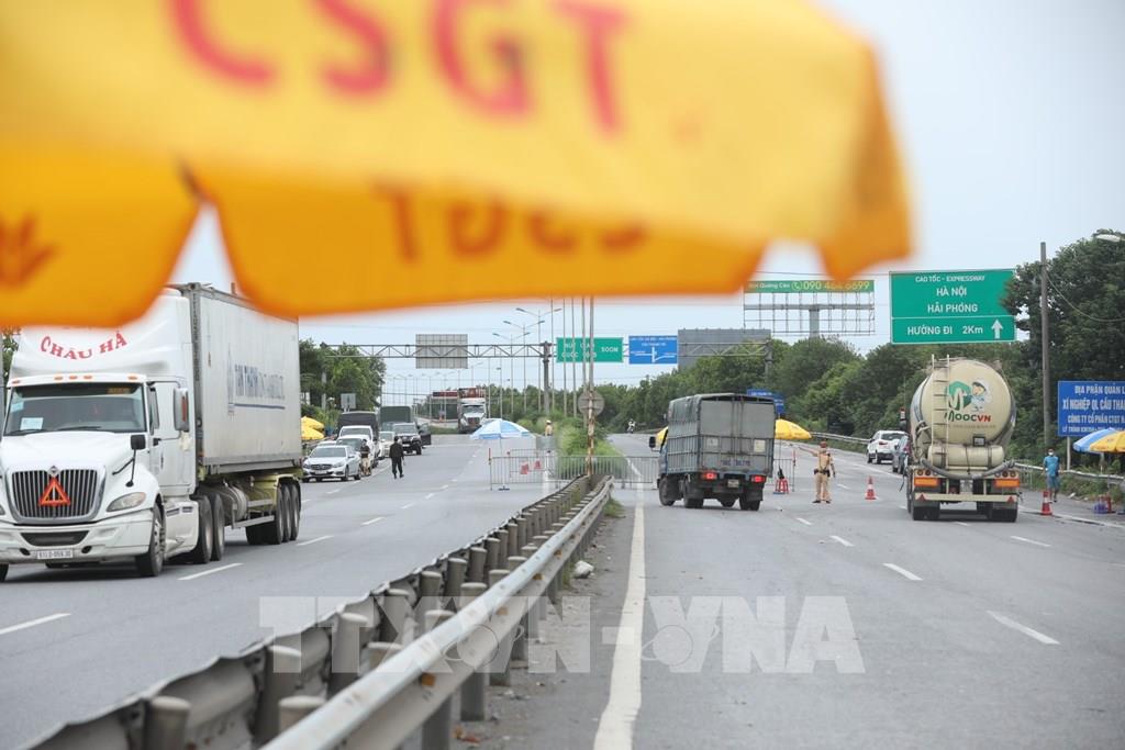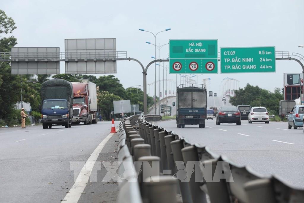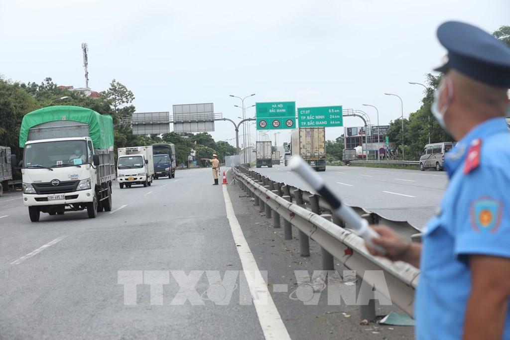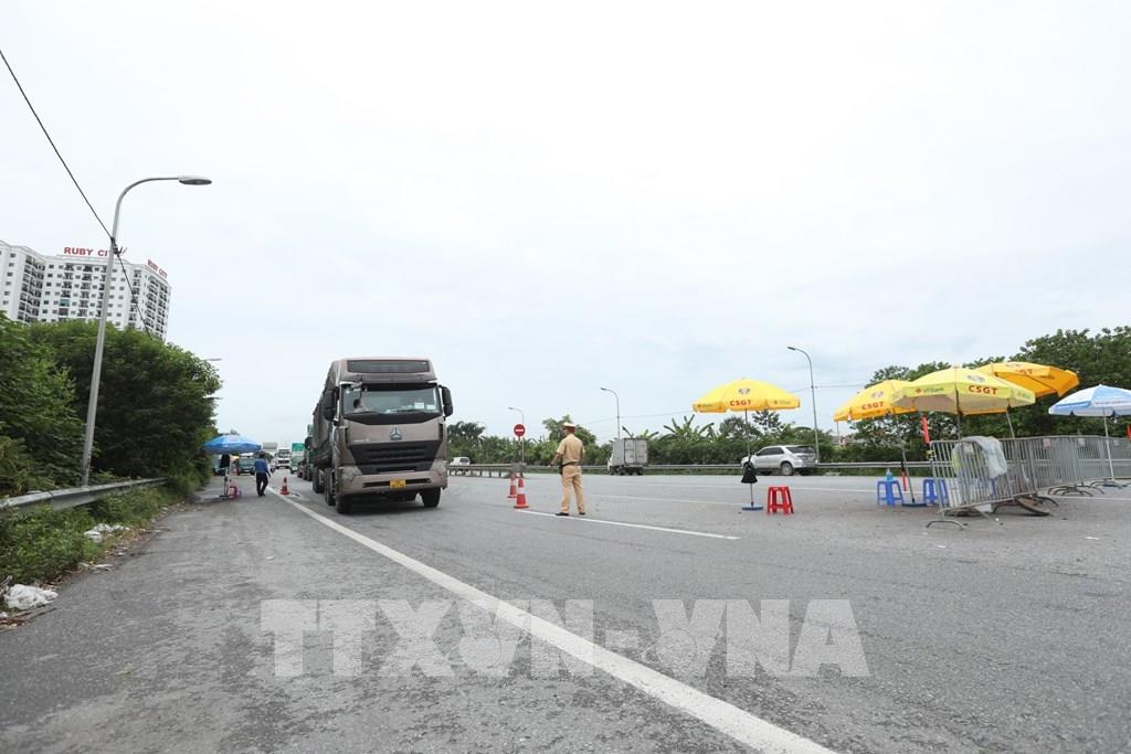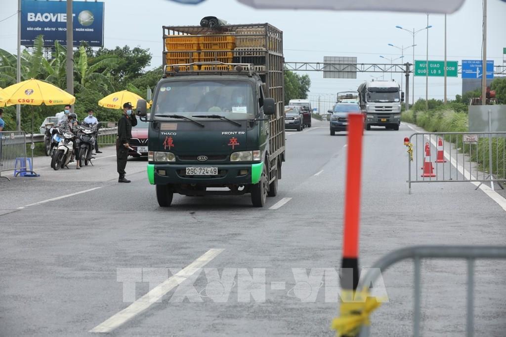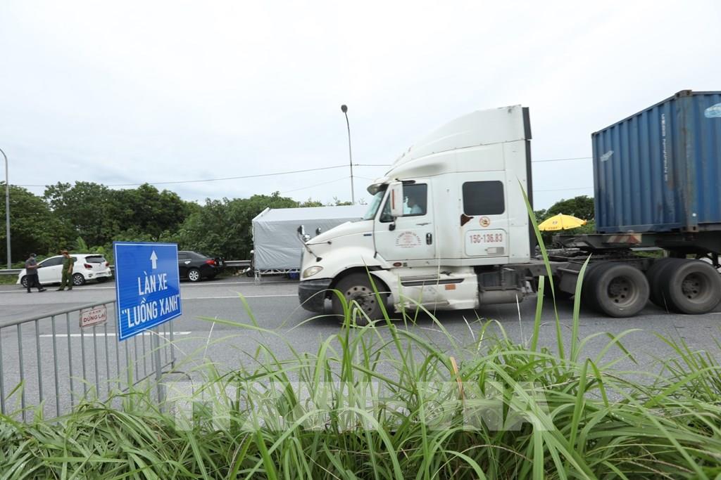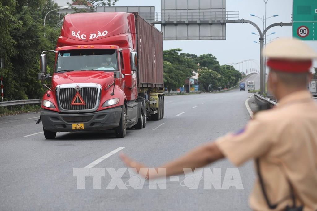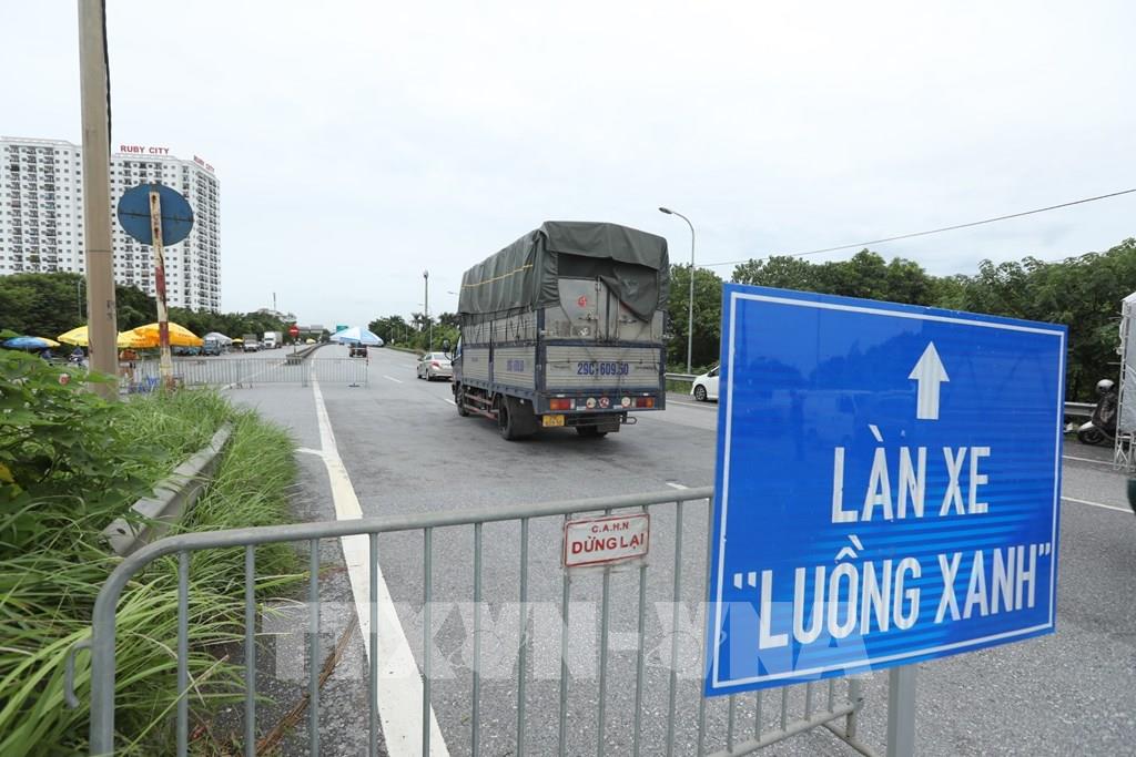 Áp dụng "Luồng xanh" để tạo thuận lợi lưu thông phương tiện, hàng hóa, không để xảy ra "đứt gãy" sản xuất, lưu thông giữa thủ đô với các địa phương trong thời gian Hà Nội giãn cách để phòng chống dịch COVID-19. Ảnh: Minh Quyết - TTXVN