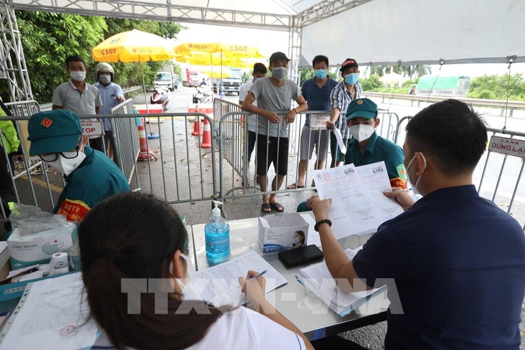 Lực lượng chức năng kiểm tra thông tin, điều kiện của người và phương tiện khi qua chốt kiểm soát cầu Phù Đổng. Ảnh: Minh Quyết - TTXVN