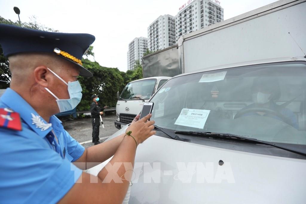 Lực lượng chức năng kiểm tra mã nhận diện QR Code của phương tiện lưu thông qua chốt kiểm soát số 5, cầu Phù Đổng, huyện Gia Lâm. Ảnh: Minh Quyết - TTXVN