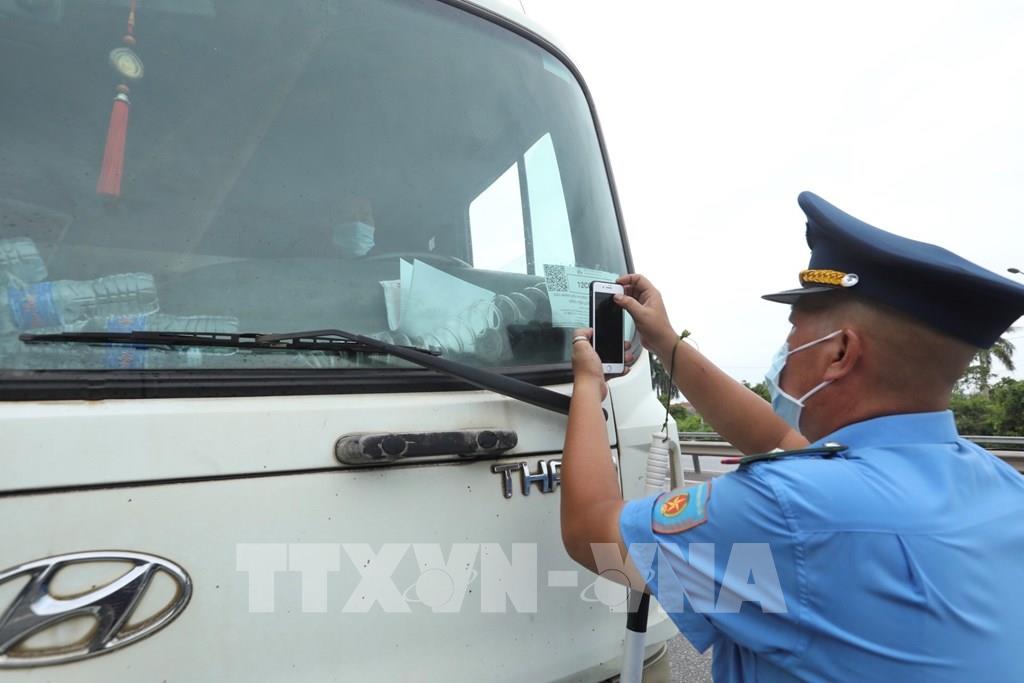 Các phương tiện chưa kịp đăng ký nhận diện có QR Code, khi kiểm tra nếu đủ điều kiện vẫn được qua chốt. Ảnh: Minh Quyết - TTXVN