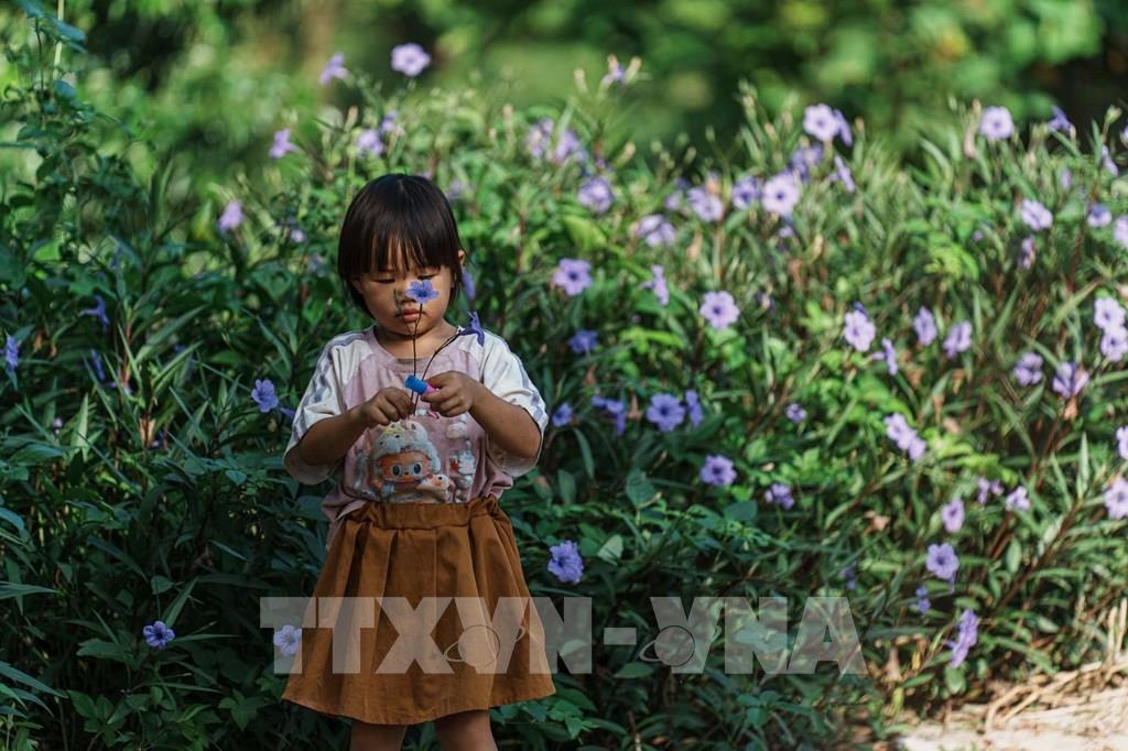 Khoảnh khắc em nhỏ chơi đùa giữa vườn hoa, phản ánh sự gắn bó tự nhiên giữa con người và môi trường sống. Ảnh: Phạm Tuấn Anh - TTXVN