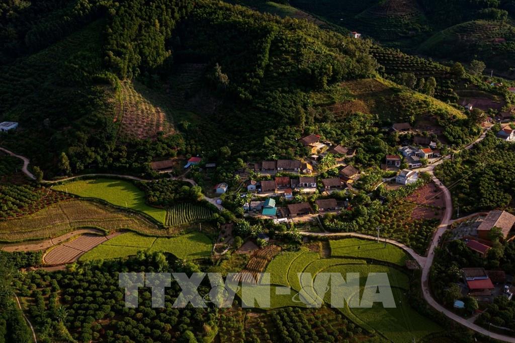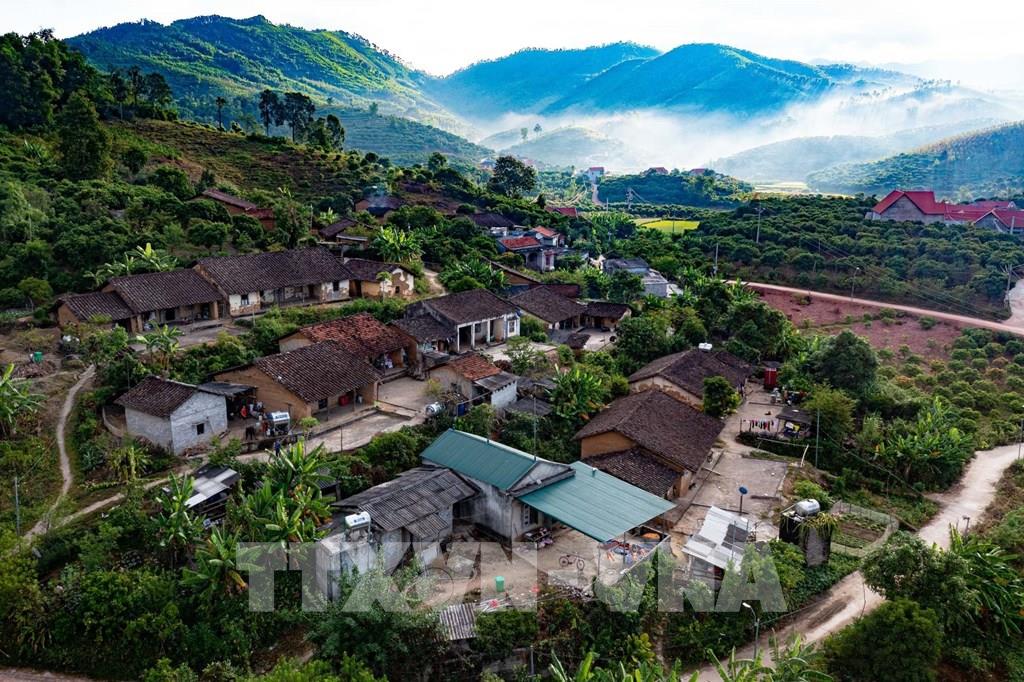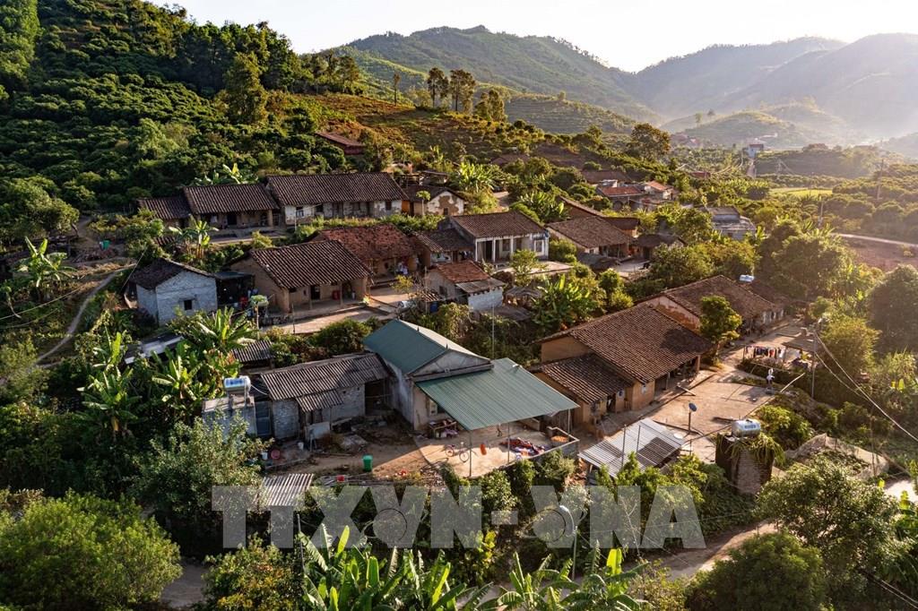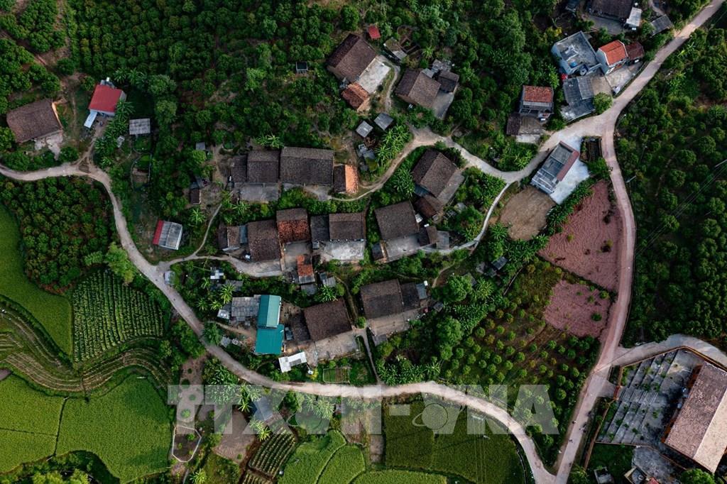 Góc nhìn từ trên cao cho thấy cấu trúc làng bản đặc trưng với đường làng uốn lượn, hòa vào địa hình tự nhiên. Ảnh: Phạm Tuấn Anh - TTXVN