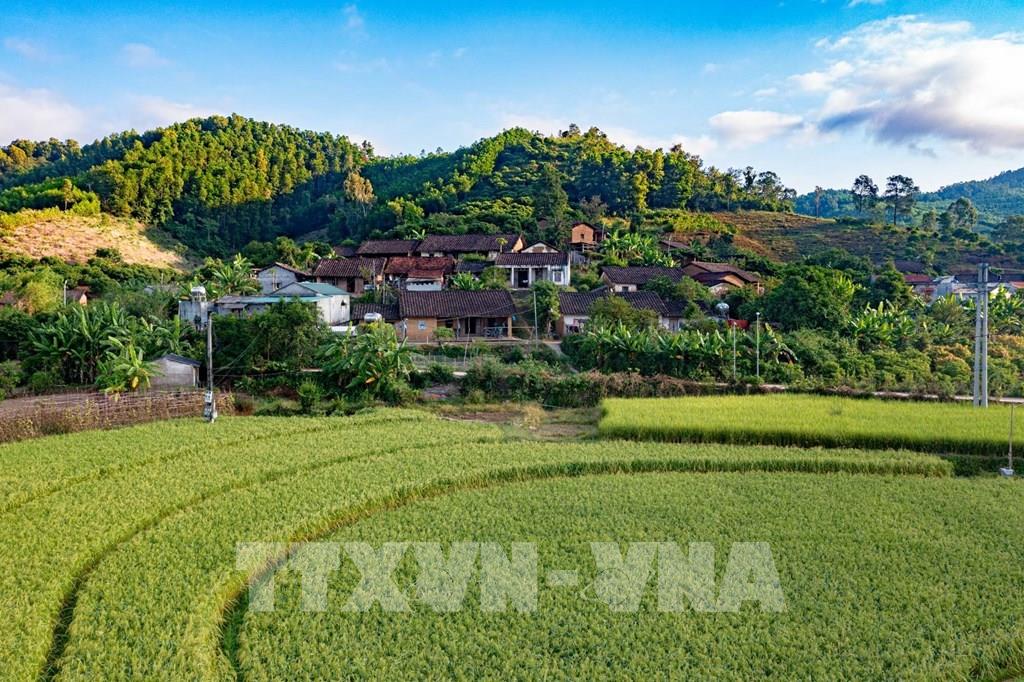 Cánh đồng lúa trải dài dưới chân núi, tạo nên điểm nhấn sinh thái hấp dẫn cho du lịch trải nghiệm. Ảnh: Phạm Tuấn Anh - TTXVN