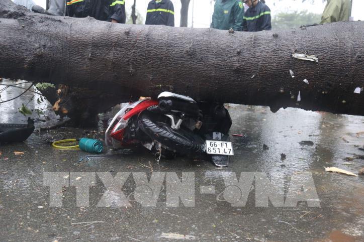 Gió bão làm bật gốc một số cây xanh trên tuyến đường Duyên Hải, thị trấn Cần Thạnh, Cần Giờ. Lực lượng chức năng đã có mặt xử lý tình huống kịp thời. Ảnh: Hoàng Hải-TTXVN