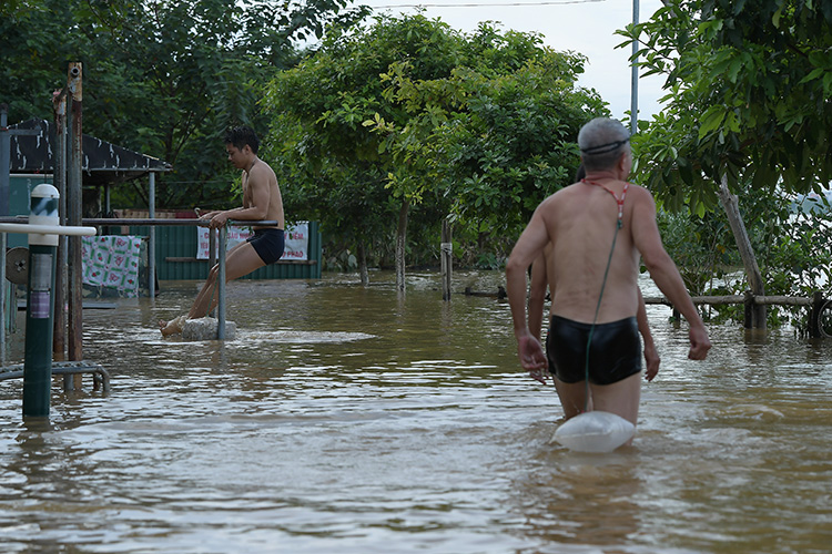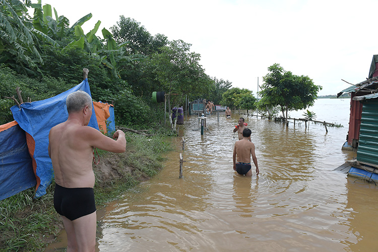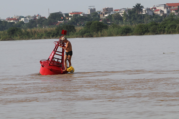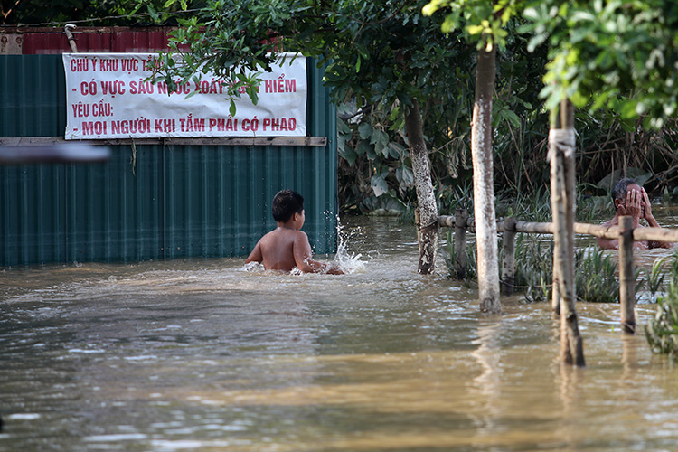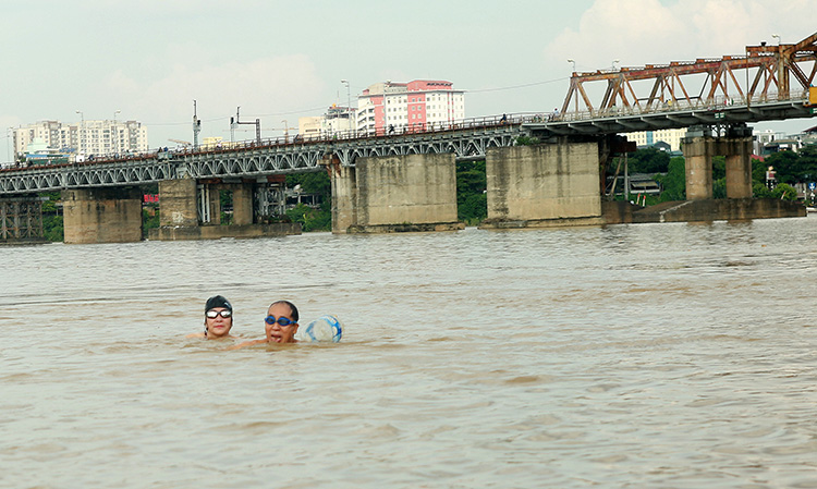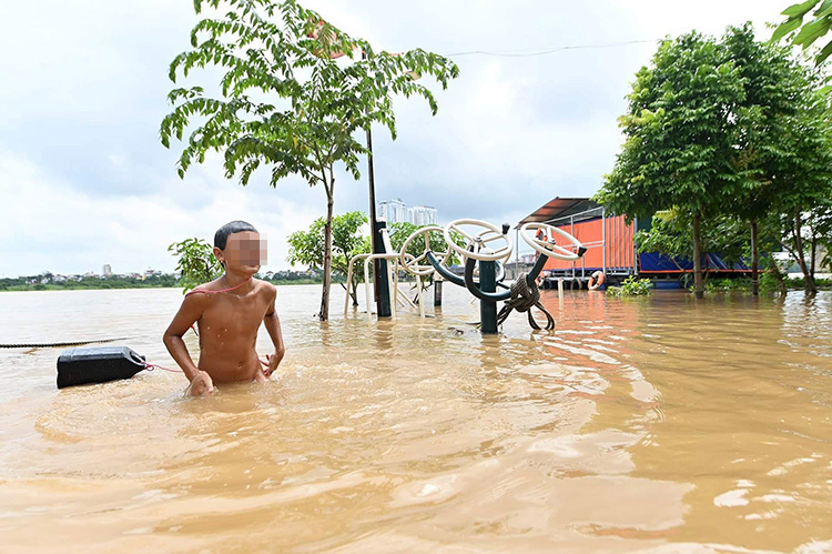 Bất chấp nguy hiểm, người dân Hà Nội tắm giữa nước lũ sông Hồng