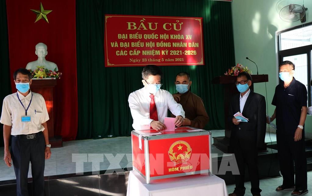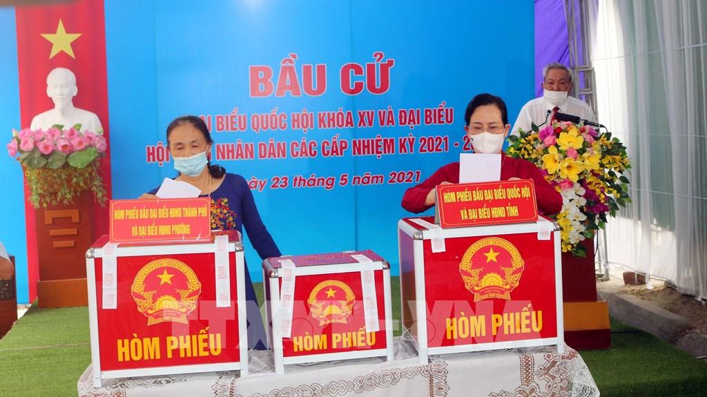 Cử tri bỏ lá phiếu đầu tiên tại Tổ bầu cử số 6, khối phố Hòa Nam, phường Tân Thạnh, Tp Tam Kỳ, tỉnh Quảng Nam. Ảnh: Trần Tĩnh - TTXVN