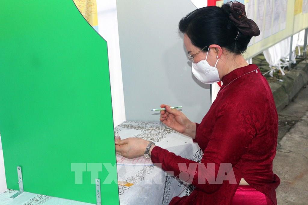 Đồng chí Bùi Thị Minh Hoài, Ủy viên Trung ương Đảng, Trưởng ban Dân vận Trung ương bỏ phiếu tại đơn vị bầu cử số 7, phường Yên Hoà, quận Cầu Giấy. Ảnh: Tuấn Đức - TTXVN