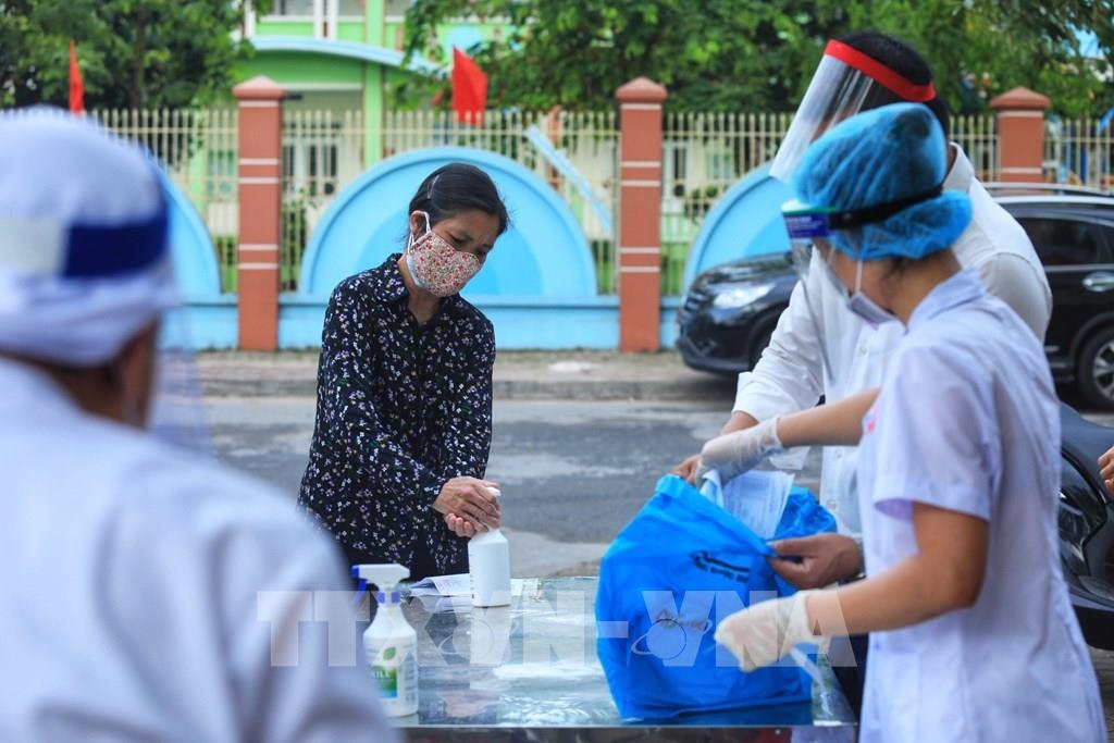 Công nhân tại khu công nghiệp Bắc Thăng Long sát khuẩn tay trước khi vào khu vực bỏ phiếu. Ảnh: Phan Tuấn Anh - TTXVN
