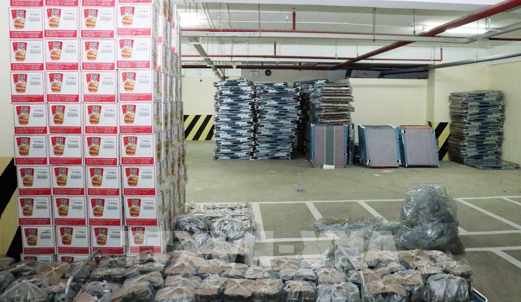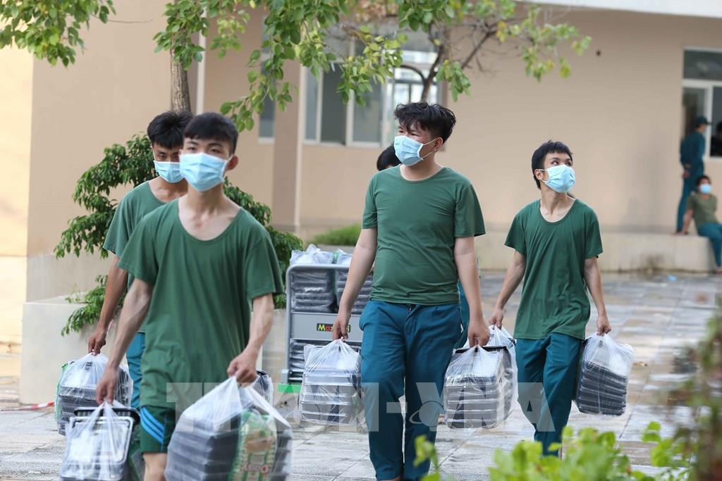 Các chiến sỹ quân đội hỗ trợ công tác vận chuyển các suất ăn từ ngoài vào các khu điều trị bệnh nhân COVID-19. Ảnh: Xuân Khu-TTXVN