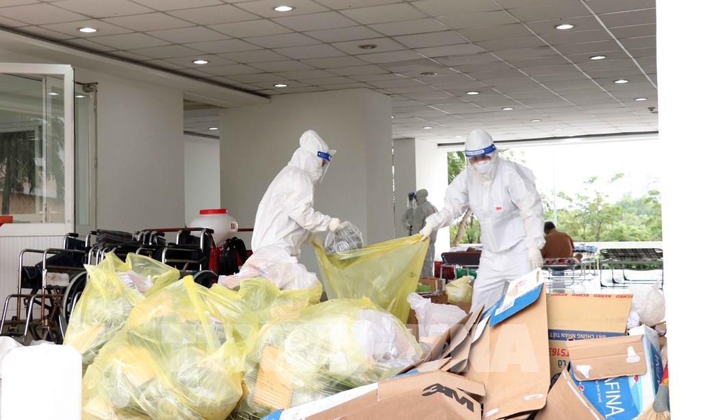 Các bác sỹ tại Bệnh viện dã chiến thu dung điều trị COVID-19 số 3 kiêm thêm cả nhiệm vụ thu dọn rác hàng ngày. Ảnh: Xuân Khu-TTXVN