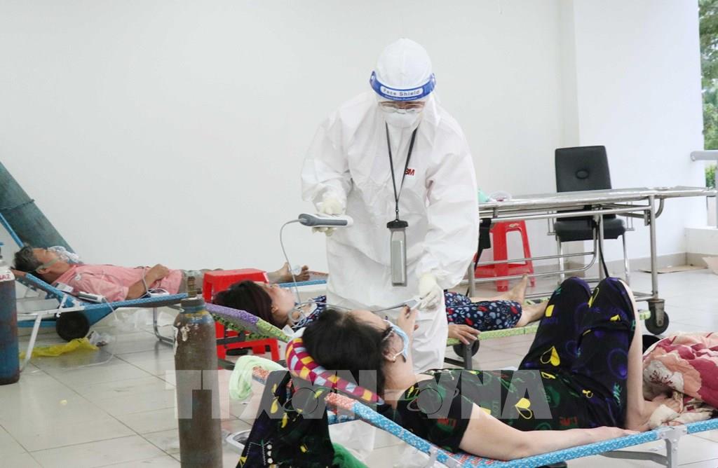 Các bác sỹ thăm khám bệnh nhân nhiễm COVID-19 không triệu chứng có bệnh nền. Ảnh: Xuân Khu-TTXVN