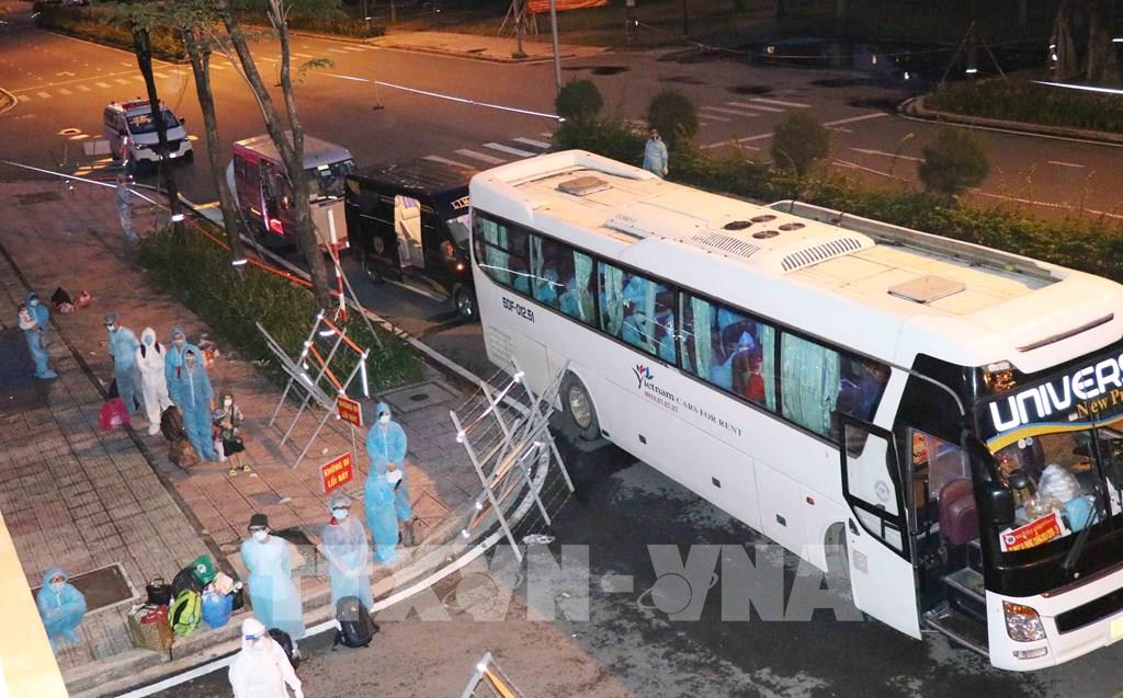 Xe ô tô chở bệnh nhân nhiễm COVID-19 đến bệnh viện thu dung điều trị số 3. Ảnh: Xuân Khu-TTXVN